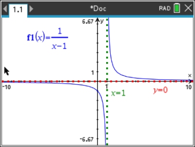 Note: The asymptotes were drawn on the graph AFTER the function was graphed. They were not part of the original graph prepared by the calculator. |
